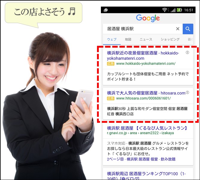 Googleで検索したときに「検索結果の上部や下部」に表示される検索連動型の広告のことです。