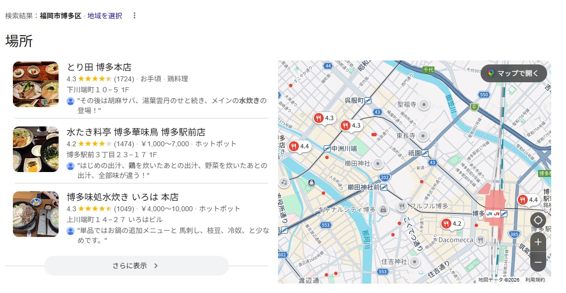このような検索では、通常の検索結果の上に 地図+店舗一覧(ローカルパック) が表示されます。
